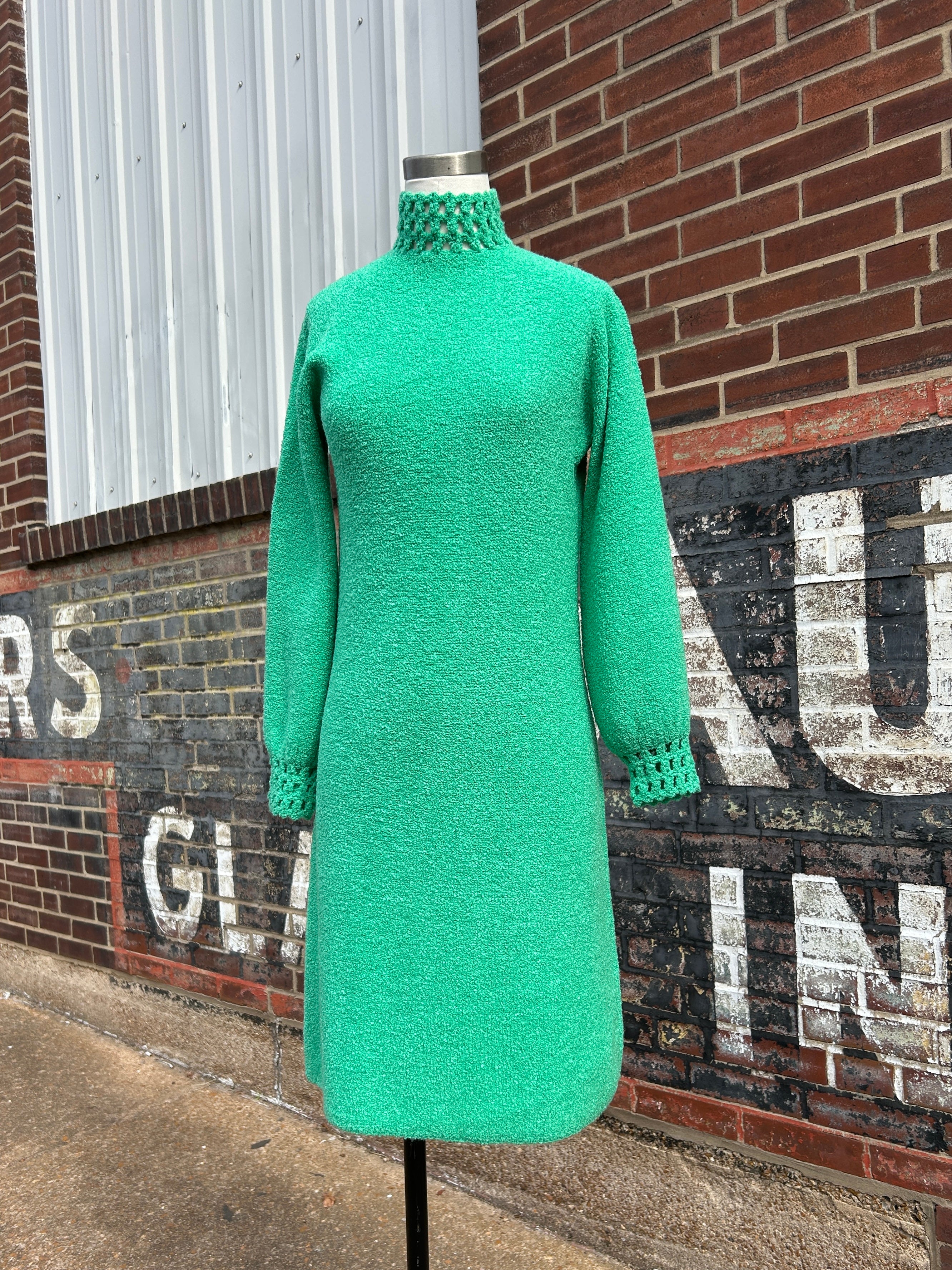 Beautiful jade green knit dress with open weave accents at the neckline and wrist. The dress is a thick, soft knit. It zips up the back and has two hook and eye closures at the neckline.