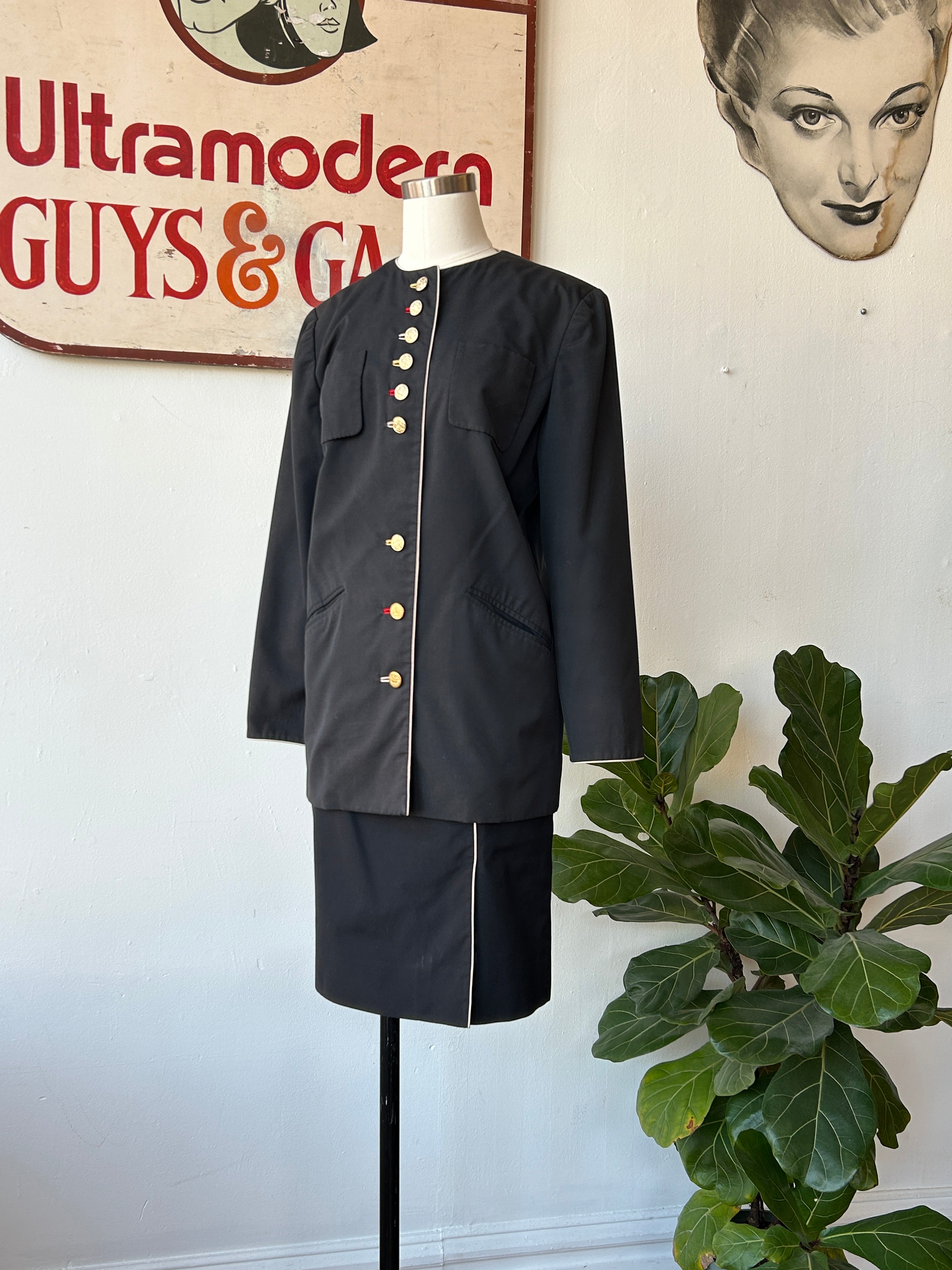 90’s jacket and skirt set with gold buttons and white piping accents. The jacket has two front chest pockets and two lower pockets. There are 2 gold buttons on each cuff. The buttonholes are differing colors, alternating yellow, red, and white, making for a cool detail.