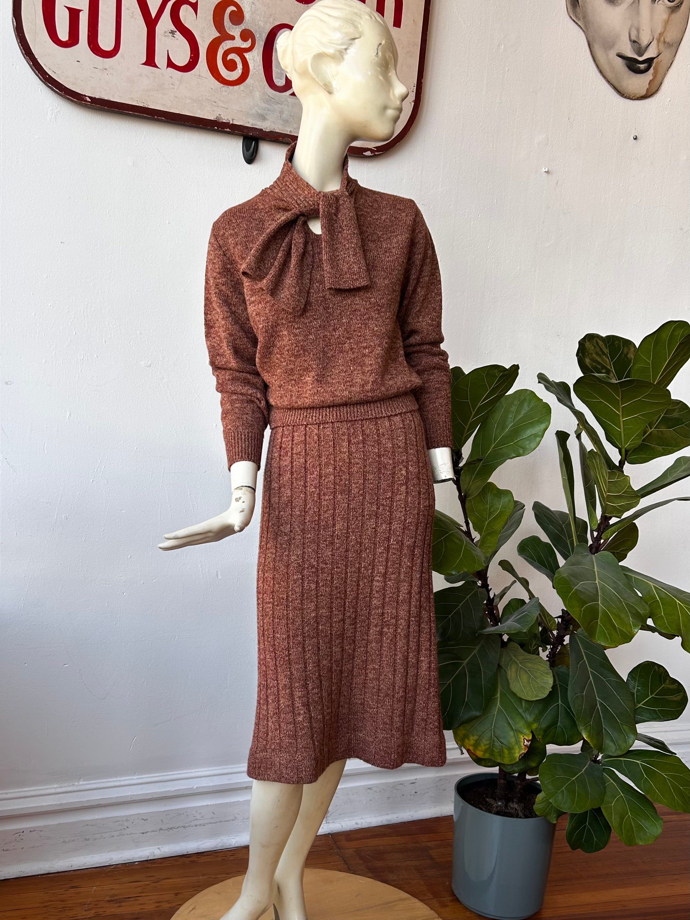 1970’s sweater set, which takes inspiration from sweater sets of the 40’s. This set is a marled rusty brown color. The sweater has ribbed cuffs and waistband and an attached tie at the ribbed neckline. The skirt has an elastic waistband and large ribbing details on the skirt. This set looks as if it has never been worn.