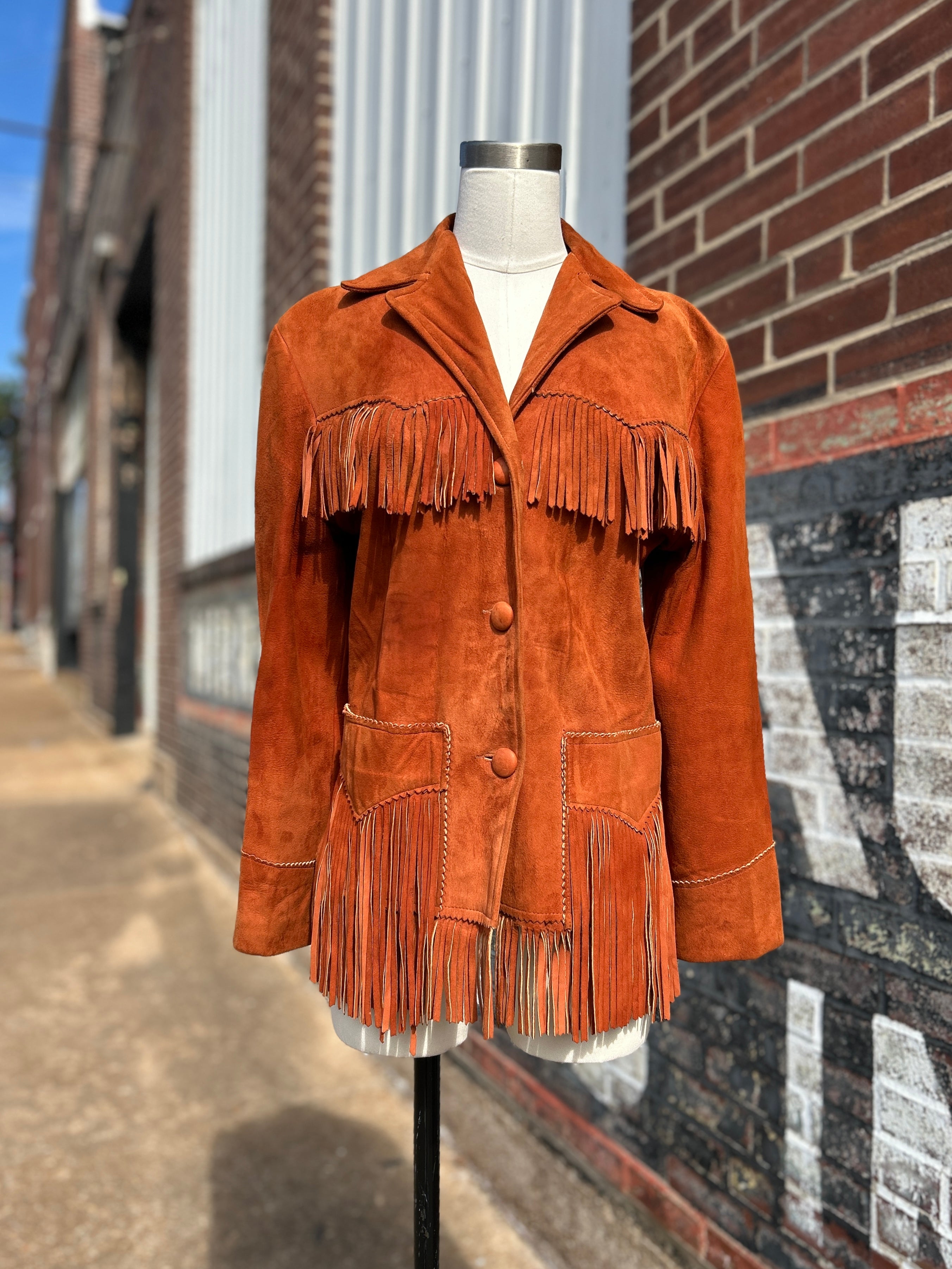 Everyone needs at least one fringed jacket! This could be that one! This 70’s jacket is a great rusty brown color with fringe on the chest, around the bottom and pockets, across the back, and down the sleeves; in short, there’s a lot of fringe! The jacket fastens with 3 suede covered buttons. There are two front patch pockets and the edges of the pockets are scalloped. There are also scallops along the tops of all fringe and on the cuffs. The jacket is fully lined with a silvery grey fabric that has a chevron print. This is one well made jacket!