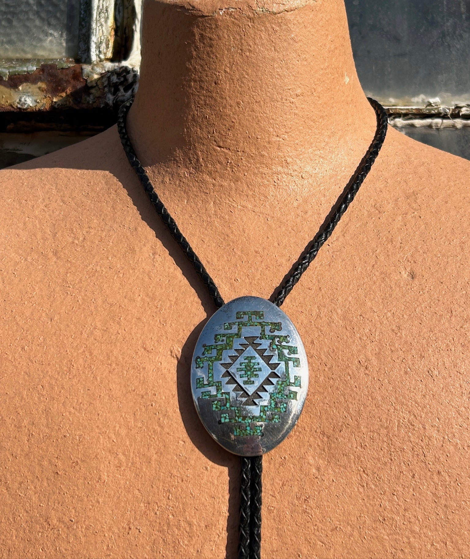 Vintage Henrietta Yesele bolo on a black braided leather cord. The bolo is a large sterling oval with inlaid turquoise chips. The bolo measures 2 1/2” long and 1 3/4” wide. The braided cord measures 19 1/2” long including the silver tips.