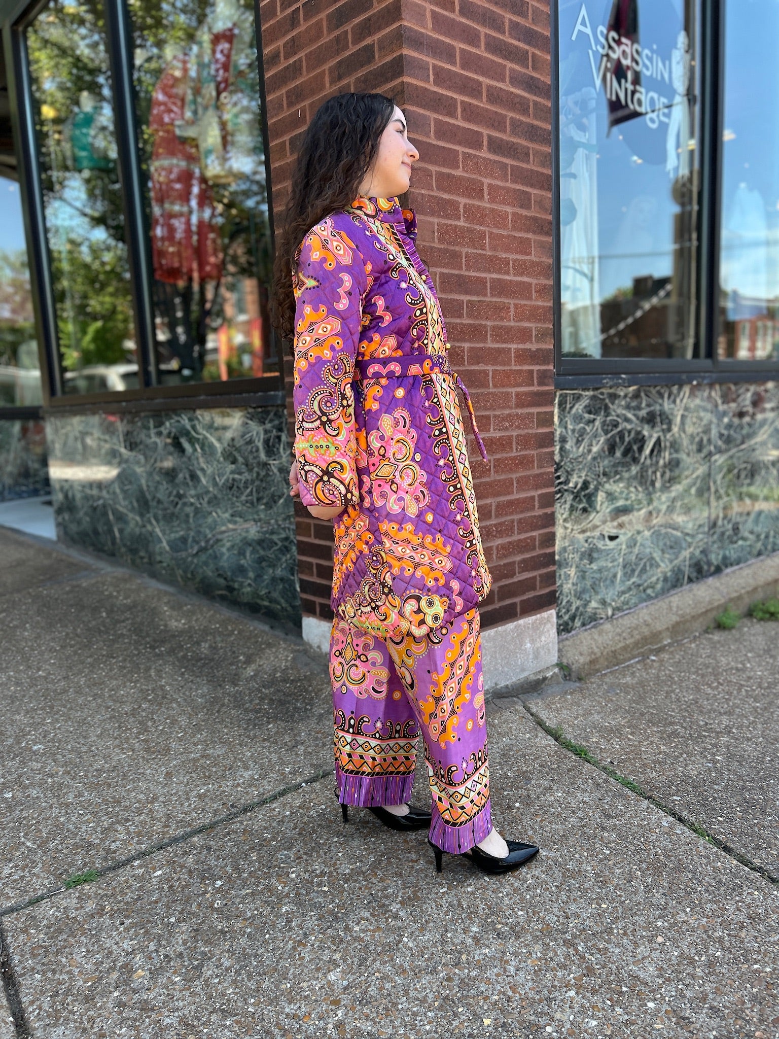 Super stylish lounge set for the cool aunt in your life; think Auntie Mame! The colors in this set are amazing; they include purple, pink, lime green, orange, and black. And just look at the print; part geometric, part mod, part psychedelic. The jacket is quilted and has four round gold buttons down the front, a snap at the neckline, along with a round pink button. The jacket has pockets and a belt that ties.