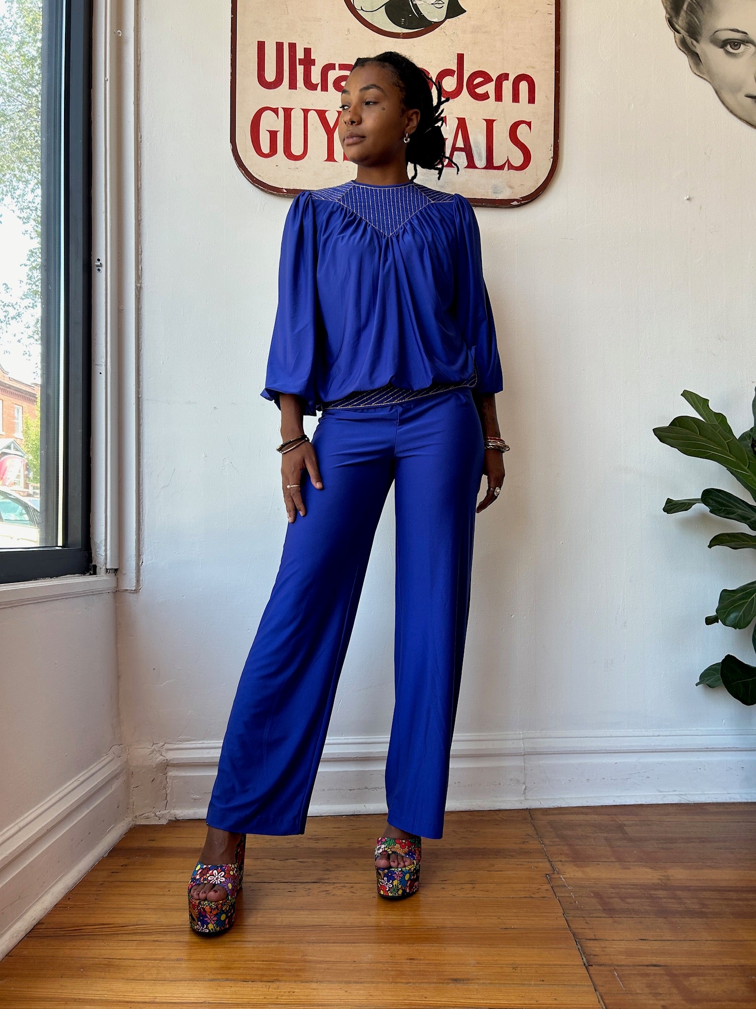 This set is a royal blue color with gold striped accents around the neckline, shoulders, and waistband. There are lots of gathers around the striped neckline, shoulders, and waistband. The overall look created is a drapey fit with slightly puffed shoulders. The cuffs are elasticized. The waistband fastens on the side with two cloth covered buttons and the neckline fastens in back with two cloth covered buttons. The pants have an elastic waistband and slightly wide legs.