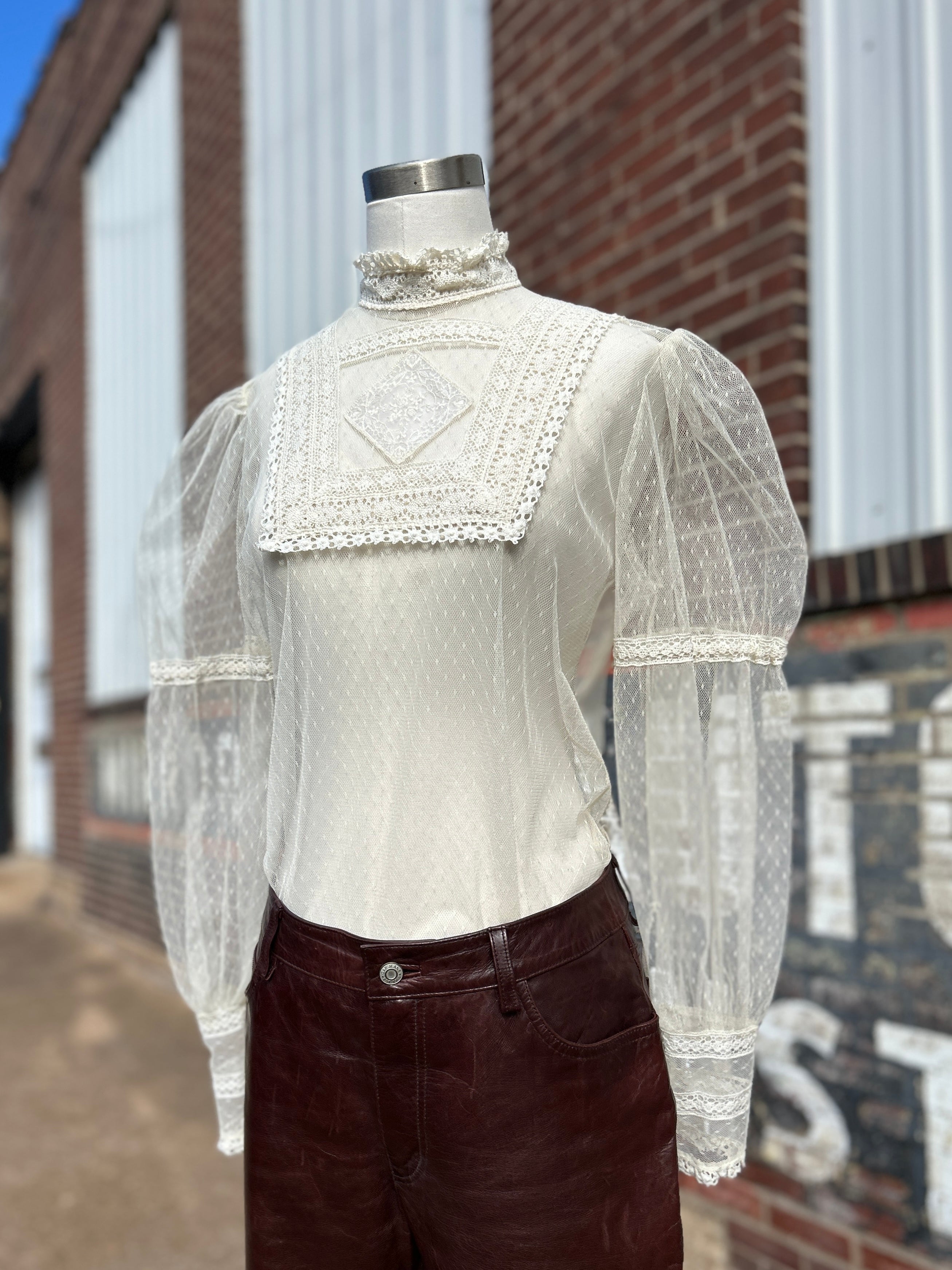 Lovely 1970’s Victorian inspired sheer mesh dotted tulle blouse with crocheted lace trim. The blouse has bishop sleeves that are long and full and gather at the shoulder and cuff. It has a high neckline of crocheted lace. The blouse buttons up the back and has cuffs that snap closed. This is a stunning blouse!