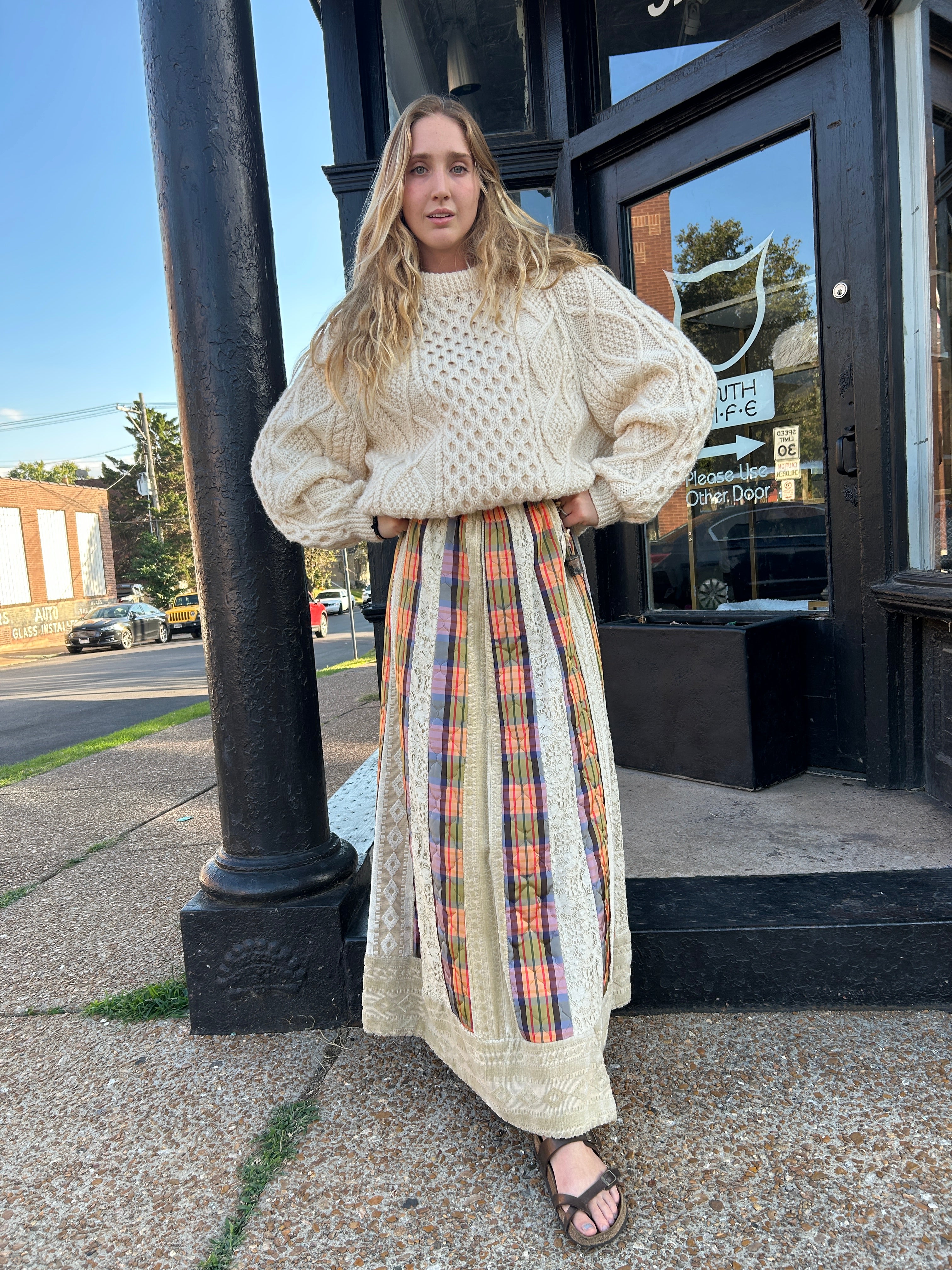 Amazing patchwork maxi skirt with a bell and ceramic maker’s mark attached at the waist. The skirt has lots of textures including lace, quilting, and velvet with a diamond pattern. There are stripes of orange, purple, and green plaid. The inside hem is gorgeous in an oatmeal and light plum design and the inside lining is an amazing patchwork look floral print with lace trim. This is a well constructed skirt. The skirt has a matching belt.